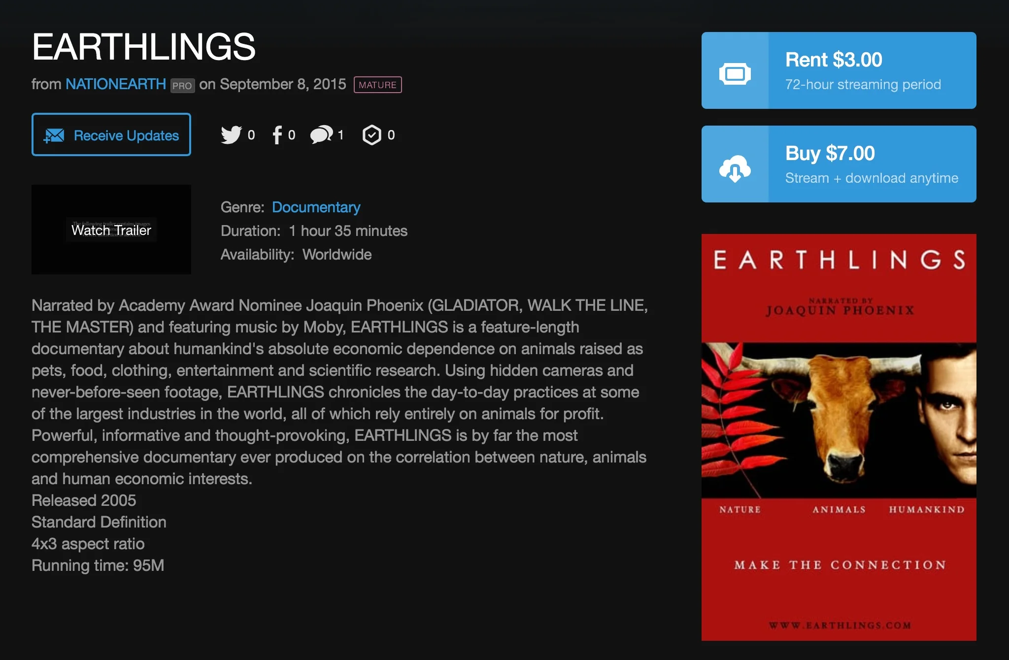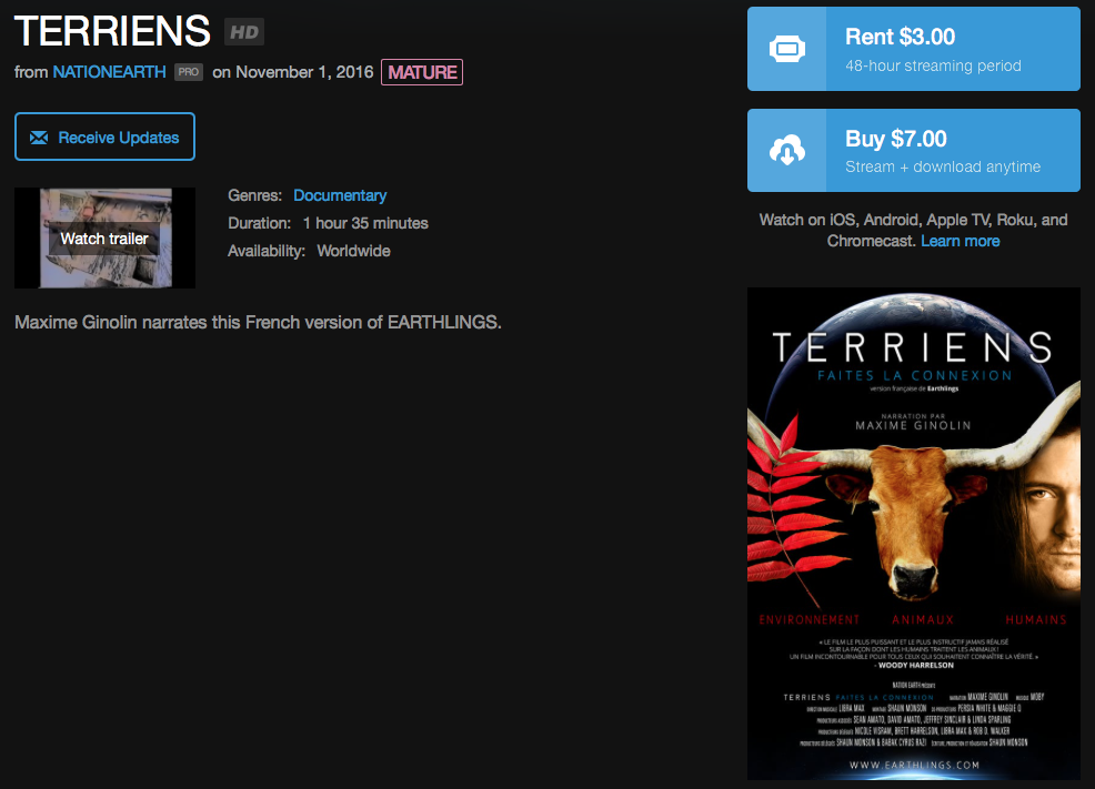 If you'd like to watch EARTHLINGS online, please click on the image above to visit Vimeo.com, where you can either rent or download the film. And thank you for supporting Nation Earth!!!